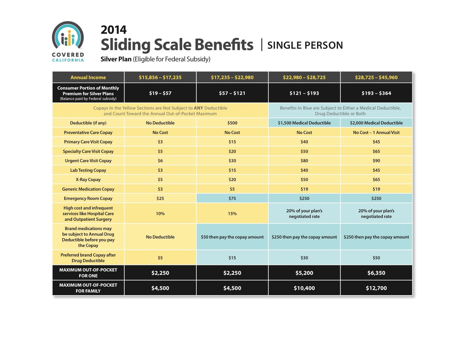 The following chart was prepared by Covered California, the state-run California exchange. This chart does not include specific California plan premiums. What it does show is the net of subsidy cost a single person would pay at the various income points for the second lowest cost Silver plan, as well as the deductibles and co-pays they can expect to see from the standard Silver plan.